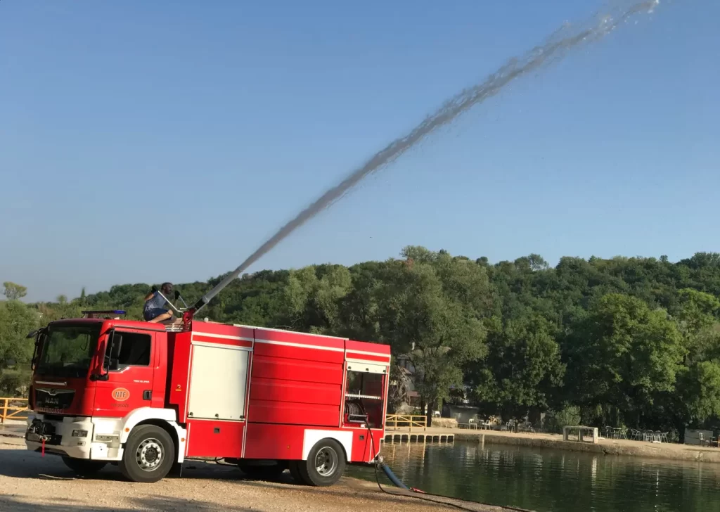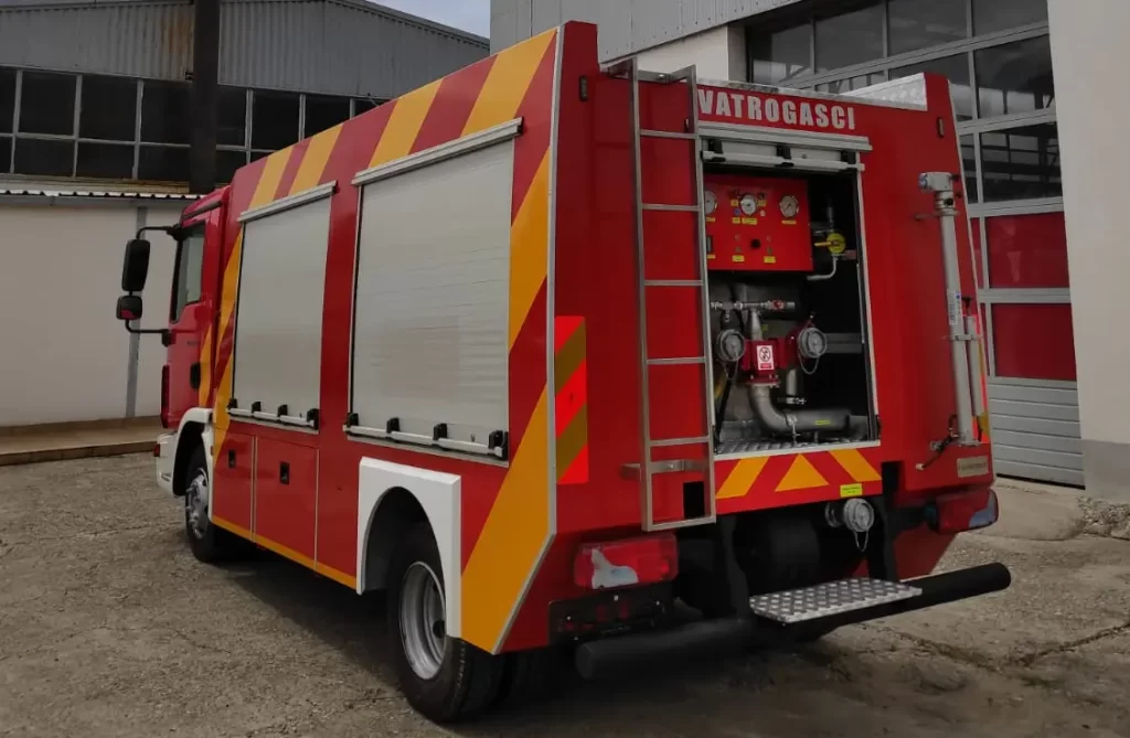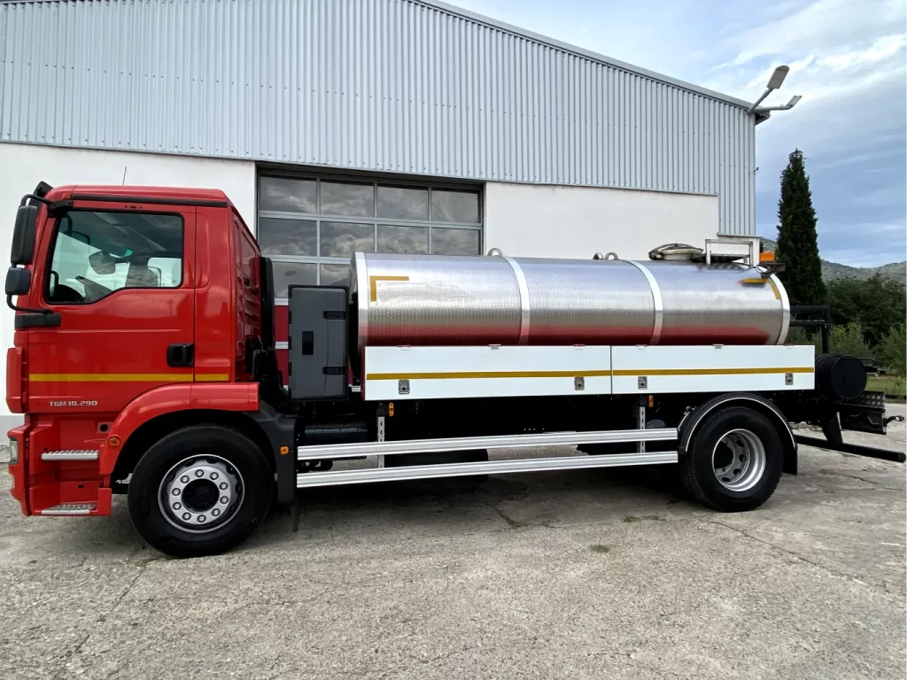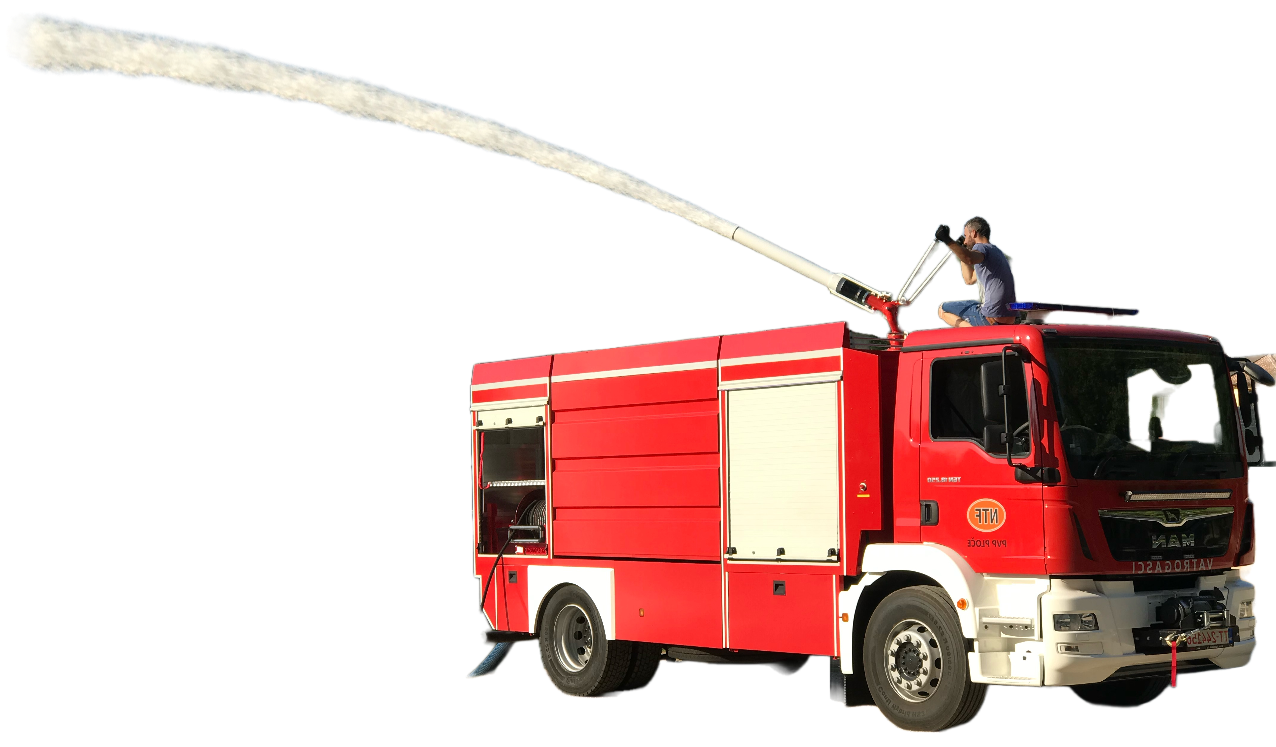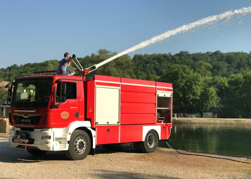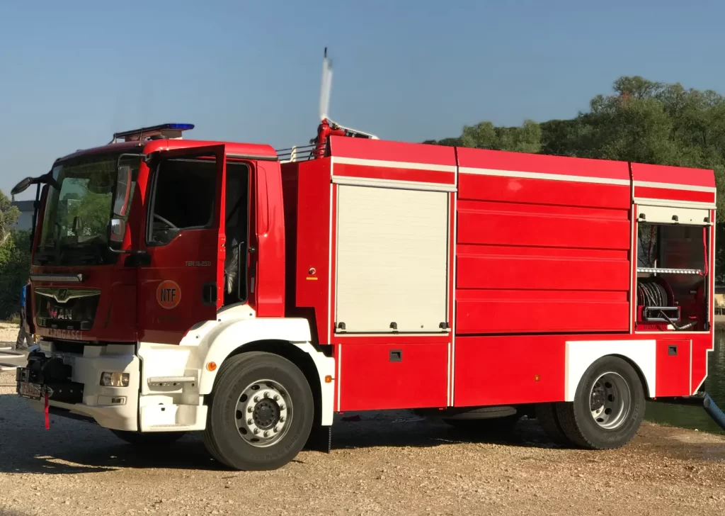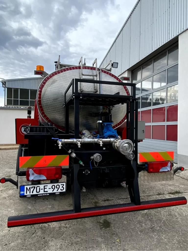 Primjer nadogradnje na podvozju MAN sa spremnikom pjenila i vode ukupne zapremine 8 000l sa urađenom pumpom marke Godiva, sa krovnim monitorom za gašenje.